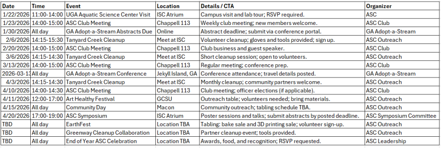 Join us for our last stream cleanup of the semester. Before we close campus for Thanksgiving break, lets give back to the environment by removing items that should not belong. Roll up your sleeves and help us keep our waterways healthy! Join us at Tanyard Creek Branch on Friday, November 11th from 2:00–4:00 PM.