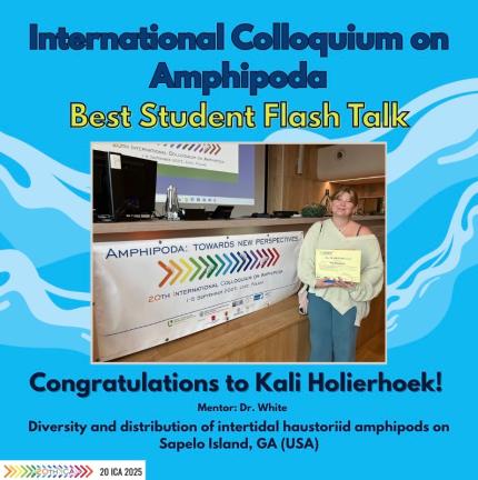 Congratulations to Kali Holierhoek, a first year graduate student in the M.S. Biology program. Last week she and Dr. Kristine White traveled to a conference in Łódź, Poland. Kali won the award for Best Student Flash Talk for her presentation on amphipod diversity around Sapelo Island, comparing it to previous studies and identifying shifts.