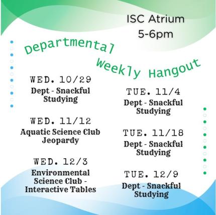 Looking for a fun way to connect with fellow biology and environmental science students outside the classroom? Come hang out with us in the ISC Atrium from 5–6pm for our Departmental Weekly Hangouts! These events are a great chance to relax, meet new people, and enjoy activities hosted by your department and student clubs.