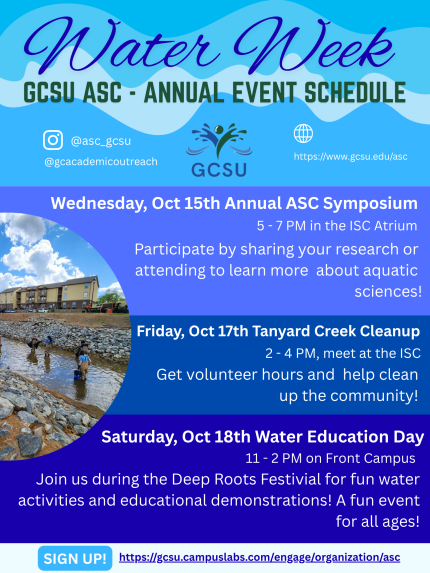 Please join us and GCSU's Academic Outreach in a week full of water! We are so exciting to be partnering with AO and sharing our passion for water and aquatics. We have multiple events planned for the week so please sign up below!
