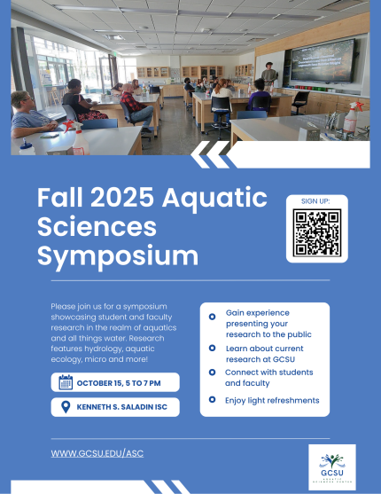 The Aquatic Sciences Center is hosting another symposium! The symposium will be in collaboration with GCSU's Academic Outreach, Phi Kappa Phi and GCSU Sustainability Council and take place outside of the Kenneth S. Saladin Integrated Science Complex from 3 to 5 PM on Friday, October 18th. We will be in the atrium of the complex as well as outside, weather permitting. Please RSVP here or with the QR code!