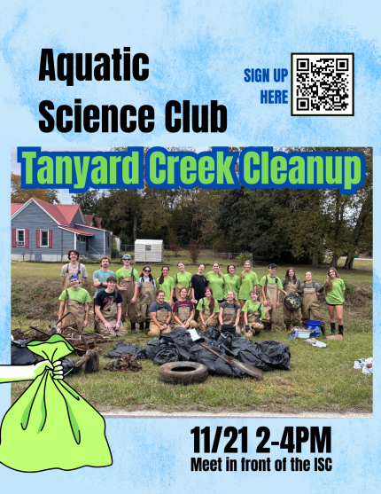 Join us for a holiday cleanup this Friday, November 15th, from 2-3PM! We will be cleaning Tanyard Branch Creek by College Station Apartments. Please meet us in front of Herty Hall wearing something that you are not afraid to get dirty. We will provide the trash picker-uppers and gloves as well as trash bags. Can't wait to see everyone there!
