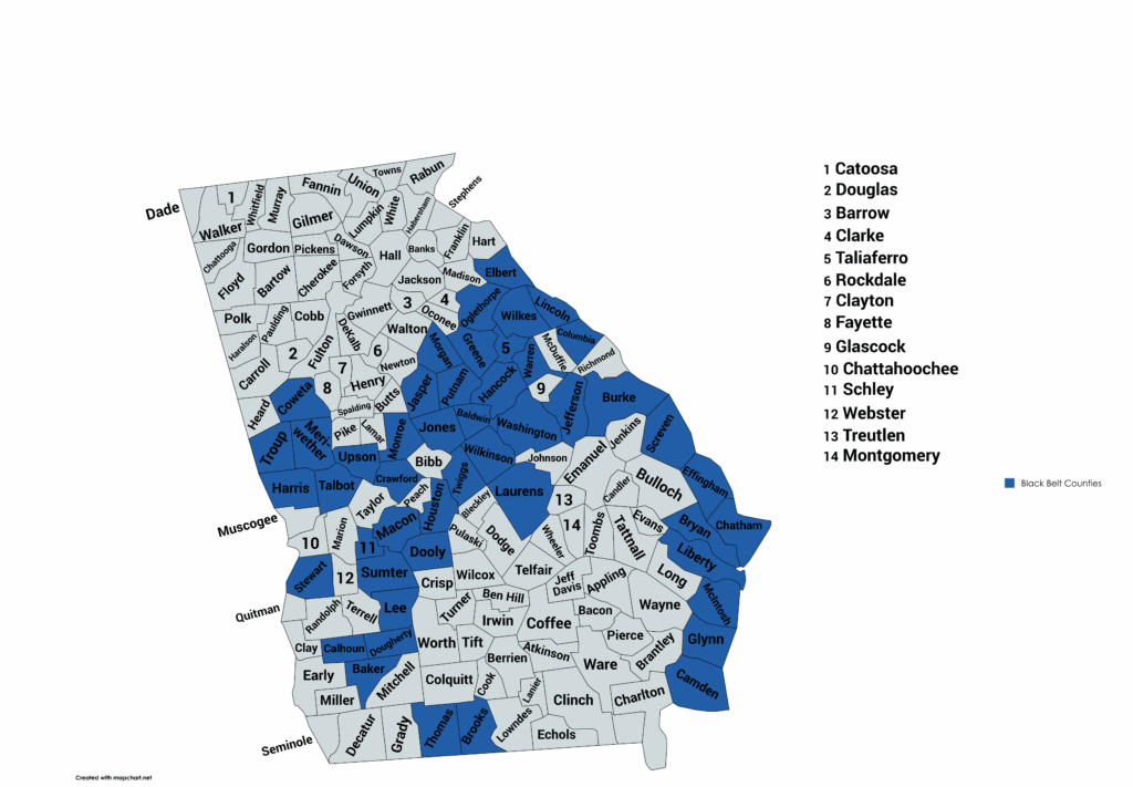 The map shown above highlights the Black Belt counties in Georgia in blue. Created with mapchart.net