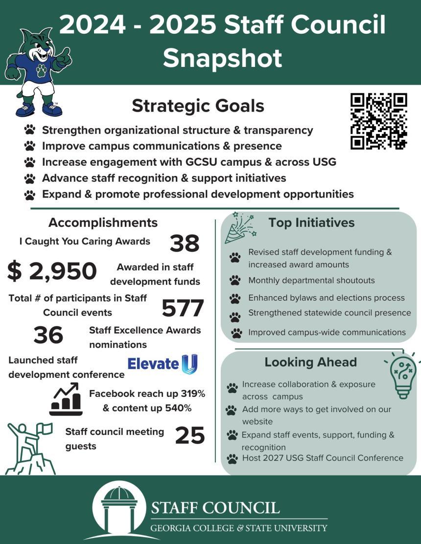 Each year, Staff Council prepares a year report to highlight our initiatives, accomplishments, and ongoing efforts to support staff across campus. These reports provide transparency, celebrate progress, and serve as a record of how Staff Council Advocates for staff needs and contributes to the university community.